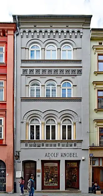 The tenement house was built around 1370. Its first owner was Gotfridus Gallicus. In the 15th century, it was rebuilt. In 1695, the name "Markowicowska Tenement" appeared in sources for the first time. In the 18th century, the house was reconstructed at the request of the Michałowski family.[1][2] The tenement burned down during the fire of Kraków in 1850. It was rebuilt in 1860 in the round-arch style, known as Rundbogenstil, inspired by early Christian and Byzantine architecture. The reconstruction design was created by architect Antoni Sacharski, and the investor was merchant Stanisław Armatys.[3] Since 1910, the building has been municipal property.[1]