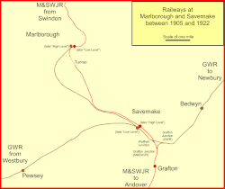 With the northern extension to Cheltenham complete, the M&SWJR turned its attention in the early 1890s to resolving its problem at Marlborough, where it was paying £1,000 a year to run over the GWR Marlborough branch tracks. The company negotiated successfully with the Marquess of Ailesbury to run a new line from the M&SWJR station in Marlborough, through a 640-yard tunnel and across Savernake Forest. The new section then crossed the GWR's Berks and Hants Extension line and joined the southern section of the original SM&AR line just north of Grafton and Burbage station.[7]