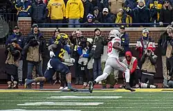 Harrison entered his sophomore season with high expectations following his breakout performance in the Rose Bowl.[24][25][26] In the Buckeyes' season opener against Notre Dame, Harrison caught five passes for 76 yards.[27] Following an injury to fellow receiver Smith-Njigba against Notre Dame, Harrison became the Buckeyes' #1 receiver for the remainder of the season.[28][29] In his first game as the team's top receiver, Harrison caught seven passes for a then career-high 184 yards and three touchdowns in a victory over Arkansas State.[28] The following week he had his second consecutive 100-yard game with 102 yards on 6 catches and two touchdowns in a blowout win over Toledo.[30] Following a relatively unimpressive first two conference games, Harrison returned to form against Michigan State, catching 7 passes for 132 yards and three touchdowns.[30][31] His three touchdowns against Michigan State marked his third career three-touchdown game, the most of any Ohio State receiver.[32]