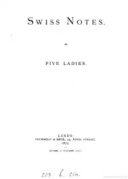 - Taylor, Mary (1875). Swiss notes, by five ladies. Leeds: Inchbold & Beck. OCLC 806089125. Text on books.google.com, official author is "Five Ladies".