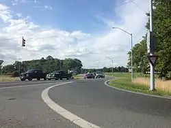 MD 589 returns to two lanes after passing Ocean Parkway, the main arterial through Ocean Pines. The state highway continues west to its junction with US 113 and MD 575, both named Worcester Highway, in Showell. The first intersection features a ramp to US 113 north and sees MD 575 head south; the ramp from US 113 north intersects MD 575 a short distance to the south. After passing under US 113, MD 589 reaches its northern terminus at West Frontage Road, which is unsigned MD 575A. Ramps from and to US 113 south are located at the northern and southern ends of MD 575A, respectively.[1][2]