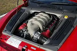 Significant changes from the prior 3200 GT engine were the larger displacement resulting from an increased cylinder bore diameter and the move to a naturally aspirated intake system which replaced the twin-turbocharged induction approach Maserati had used for the previous 20 years, fundamentally because the powertrain was now Ferrari based.[24][25] The crankshaft is of crossplane design. The engine operates at a compression ratio of 11.1:1 with the eight cylinders configured in a 90° V design. The cylinder bore diameter is 92 mm (3.62 in) and piston stroke length is 80 mm (3.15 in).[23] The engine shares many of the design features of modern racing engines, including dry sump lubrication, a pump assembly located outside the crankcase, and four valves per cylinder.[26] The 32-valve DOHC utilises chain-driven, twin-overhead camshafts that provide valve actuation in less than 0.15 seconds, with the intake cams being controlled by variable valve timing.[27] The crankcase and cylinder heads are made from an aluminium and silicon alloy, giving the engine a relatively light weight of 184 kg (406 lb).[2]