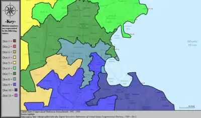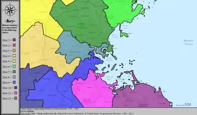 Table of United States congressional district boundary maps in the State of Massachusetts, presented chronologically.[5] All redistricting events that took place in Massachusetts between 1973 and 2013 are shown.