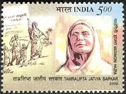 Matangini Hazra (19 October 1869 – 29 September 1942[1]) was an Indian revolutionary who participated in the Indian independence movement. She was leading one of the five batches of volunteers (of the Vidyut Bahini), constituted by the Samar Parisad (War Council), at Tamluk to capture the Tamluk Police Station on 29 September 1942, when she was shot dead by the British Indian police in front of the police station, becoming the first "Quit India" movement martyr in Midnapore. She was a staunch Gandhian and was fondly called Gandhi buri, Bengali for "old lady Gandhi".[2][3][4]