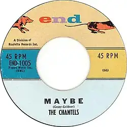 "Maybe" is a song with words and music originally credited to End Records owner George Goldner and "Casey". The co-writing credit was later transferred to Richard Barrett. Arlene Smith, lead singer of the Chantels, is believed to be an uncredited co-writer.[1] The song was first recorded by the Chantels on October 16, 1957, in a doo-wop style with Barrett playing piano, and released in December 1957. It climbed the charts in January 1958, reaching No. 15 in the Billboard Hot 100 and No. 2 in the Billboard R&B chart. It was subsequently described as "arguably, the first true glimmering of the girl group sound".[2] Rolling Stone ranked it No. 199 on its list of The 500 Greatest Songs of All Time.[1] It was also included in Robert Christgau's "Basic Record Library" of 1950s and 1960s recordings, published in Christgau's Record Guide: Rock Albums of the Seventies (1981).[3]