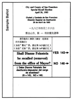 - ^ "MAYOR FEINSTEIN, BY WIDE MARGIN, DEFEATS SAN FRANCISCO RECALL BID". The New York Times. April 27, 1983. Archived from the original on December 10, 2020. Retrieved December 12, 2020.