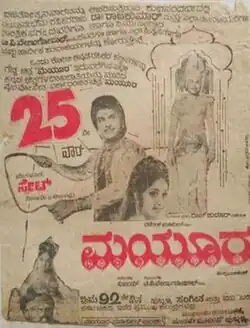 Mayura (ⓘ) is a 1975 Indian Kannada-language historical drama film, directed by Vijay.[2] It is one of the most popular films of acclaimed Kannada actor Rajkumar, who plays the role of Prince Mayurasharma of the Kadamba dynasty, the earliest native kingdom to rule over what is today the modern state of Karnataka. The film depicts the life of Mayura, a Brahmin youth, as he discovers his royal heritage and realizes his destiny of ascending to the throne of the then-Pallava kingdom.