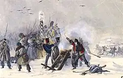 Another disastrous year in the history of Medininkai was 1812. The French Grand Armee, during their withdrawal from Russia was back in central Lithuania. In extremely harsh winter conditions (on Dec 6 the temperature in Medininkai was -37,5 °C)[68] when seeking wood to warm up, the troops stationed in the town burnt down all facilities within the castle and destroyed a large part of the town itself;[69] the French also looted the place[70] before withdrawing further west. Grabowski continued his private war; 1815 marks another assault of his men, who robbed municipal property and cut down much of the municipal forest. The same year the presbytery was destroyed by fire, it is not clear whether the result of arson or an accident.[71] The parochial census of 1827 documents another period of demographic regress; it recorded 208 households and 1,386 faithful,[72] merely 40% of the population listed in the census carried out 46 years earlier.[56] Medininkai was not even marked on a Russian map from the 1820s, though it was located on a major route and though similar or minor neighboring locations, like Rukojnie/Rukainiai, Kiena/Kena or Turgiele/Turgeliai were marked; even the Kamienny Ług hamlet was acknowledged.[73]