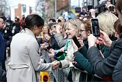 In July 2018, Meghan's first official trip abroad as a royal was to Dublin, Ireland, alongside Harry.[110][111] In October 2018, the Duke and Duchess traveled to Sydney for the 2018 Invictus Games.[112] This formed part of a Pacific tour that included Australia, Fiji, Tonga and New Zealand.[113][114] As representatives of the Queen, the couple were greeted warmly by crowds in Sydney, and the announcement of Meghan's pregnancy hours after their arrival delighted the public and media.[114][115] During their visit to Morocco in February 2019, the Duke and Duchess focused on projects centered on "women's empowerment, girls' education, inclusivity and encouragement of social entrepreneurship".[116] Meghan also participated in her husband's work as youth ambassador to the Commonwealth, which included overseas tours.[117][118]
