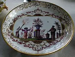 Böttger's experimental wares rapidly gained quality but never achieved successful painted and fired decor. The first successful ornaments were gold decorations applied upon the fired body and finely engraved before they received a second firing at a lower temperature. The lacy frameworks outside painted scenes known in German as Laub- und bandelwerk in red, gold or puce, were often used.[9] Augustus II charged first Johann Jakob Irminger with the design of new vessels. In 1720 Johann Gregor Herold became the director and in 1723 introduced brilliant overglaze colours that made Meissen porcelain famous, with an increasingly broad palette of colors that marked the beginning of the classic phase of Meissen porcelain. His enamel paints are still the basis for modern ceramic paints. Initially painting mostly imitated the oriental designs known from Chinese and Japanese export porcelain, but some European landscape scenes were painted from early on.[10]