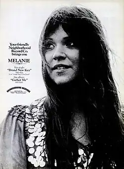 In the 1960s, Melanie started performing at The Inkwell, a coffee house in the West End section of Long Branch. After high school, her parents insisted that she attend college, so she studied acting at the American Academy of Dramatic Arts in New York.[10] She began singing in the folk clubs of Greenwich Village, such as The Bitter End, and signed her first recording contract with Columbia Records.[11] Melanie released two singles on the label in the U.S. She subsequently signed with Buddah Records and found her first chart success in Europe in 1969 with "Bobo's Party", which reached No. 1 in France. Her popularity in Europe resulted in performances on European television programs such as Beat-Club in West Germany. Her debut album received positive reviews from Billboard, which described her voice as "wise beyond her years" and said her "non-conformist approach to the selections on this LP make her a new talent to be reckoned with".[12][13]