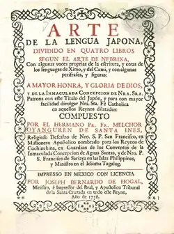 Oyanguren's descriptive grammars, Arte de la lengua japona (1738) and Tagalysmo elucidado y reducido (1742), both published in Mexico, were not well received at the time of publication. Copies of the Arte de la lengua japona are very rare, but a modern edition was printed in 2009.[1] Tagalysmo was his second Tagalog grammar. His first was published in Latin in 1723. Since it was not well received, he rewrote it in Spanish.[2] Oyanguren also wrote two grammars of Basque, both now lost: Arte de la lengua Vascongada (date unknown) and El Cantabrismo elucidado (1715). His trilingual dictionary of Basque, Spanish and Tagalog is also thought to be lost.[1]