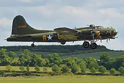 A French B-17G (F-BEEA), used as a filming platform, hit a tree and a pile of gravel after losing engine power and swinging during takeoff from Binbrook and was destroyed by the subsequent fire. All 10 of the crew escaped with only minor injuries, the most serious of which being a broken leg. While lined up on runway 21 awaiting takeoff, a puff of smoke was observed by a ground engineer from the vicinity of engine three which he conjectured could have been due to an over-boost. The aircraft commenced its ground roll and after about 100 yards (91 m) swung slightly to the left, which the commander (the handling pilot) corrected with the rudder and by reducing power to number 3 and 4 engines. Once corrected full power on all engines was resumed but the aircraft swung right. The commander applied corrective rudder and reduced power to number 1 and 2 engines, but this was not immediately effective and the aircraft left the runway before straightening, parallel to the runway. Knowing that the aircraft was capable of being operated from grass landing strips, the pilot opted to continue the takeoff; however, after 400–500 yards (370–460 m) and at an airspeed of 90–95 miles per hour (145–153 km/h) the aircraft swung right and its course was obstructed by a tree which was hit by the left wing and a pile of gravel which was hit by the number 4 propeller. The aircraft yawed to the right and came to rest in a cornfield; the fuselage broke into two sections aft of the bomb bay and caught fire.[2]