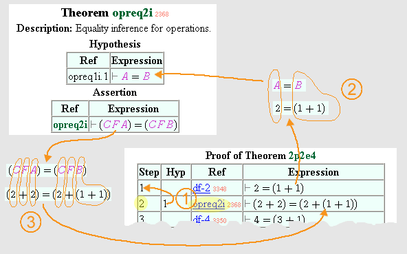 Here is a detailed example of how this algorithm works. Steps 1 and 2 of the theorem 2p2e4 in the Metamath Proof Explorer (set.mm) are depicted left. Let's explain how Metamath uses its substitution algorithm to check that step 2 is the logical consequence of step 1 when you use the theorem opreq2i. Step 2 states that ( 2 + 2 ) = ( 2 + ( 1 + 1 ) ). It is the conclusion of the theorem opreq2i. The theorem opreq2i states that if A = B, then (C F A) = (C F B). This theorem would never appear under this cryptic form in a textbook but its literate formulation is banal: when two quantities are equal, one can replace one by the other in an operation. To check the proof Metamath attempts to unify (C F A) = (C F B) with ( 2 + 2 ) = ( 2 + ( 1 + 1 ) ). There is only one way to do so: unifying C with 2, F with +, A with 2 and B with ( 1 + 1 ). So now Metamath uses the premise of opreq2i. This premise states that A = B. As a consequence of its previous computation, Metamath knows that A should be substituted by 2 and B by ( 1 + 1 ). The premise A = B becomes 2=( 1 + 1 ) and thus step 1 is therefore generated. In its turn step 1 is unified with df-2. df-2 is the definition of the number 2 and states that 2 = ( 1 + 1 ). Here the unification is simply a matter of constants and is straightforward (no problem of variables to substitute). So the verification is finished and these two steps of the proof of 2p2e4 are correct.