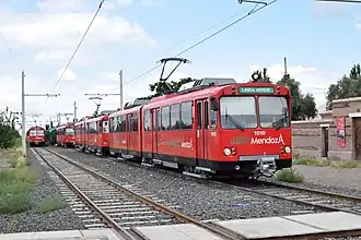 The service was initially provided by eleven Siemens–Duewag U2 light-rail vehicles (LRVs) acquired secondhand from the San Diego Trolley system in San Diego, California.[28][29] The first four (ex-San Diego cars 1028, 1055, 1070, and 1071) arrived in Mendoza in February 2011.[30] More had arrived by November 2011,[31] and the delivery was completed with the final two cars arriving on 27 April 2012.[32] In 2022, the San Diego Metropolitan Transit System sent 39 Siemens SD-100 light rail vehicles.[33]