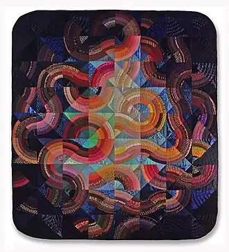 James describes the quilts he made between 1992 and 1995 as a "last hurrah" for the strip-pieced panel technique, and he is best known for the work that he produced during this period.[51] In 1992 James was awarded an honorary Doctor of Fine Arts degree from the University of Massachusetts at Dartmouth, his alma mater, and the following year, he was the 25th person to be inducted into the Quilter's Hall of Fame in Marion, Indiana.[52] His quilt Quilt No. 150: Rehoboth Meander was acquired by the Renwick Gallery of the Smithsonian American Art Museum in Washington, D.C.,[22] under the auspices of the James Renwick Alliance, in 1994.[53]