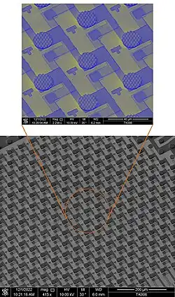 There are several methods to manufacture microLED displays. The flip-chip method manufactures the LED on a conventional sapphire substrate, while the transistor array and solder bumps are deposited on silicon wafers using conventional manufacturing and metallization processes. Mass transfer is used to pick and place several thousand LEDs from one wafer to another at the same time, and the LEDs are bonded to the silicon substrate using reflow ovens. The flip-chip method is used for micro displays used on virtual reality headsets. Another microLED manufacturing method involves bonding the LEDs to an IC layer on a silicon substrate and then removing the LED bonding material using conventional semiconductor manufacturing techniques.[48][49][50] The current bottleneck in the manufacturing process is the need to individually test every LED and replace faulty ones using an excimer laser lift-off apparatus, which uses a laser to weaken the bond between the LED and its substrate. Faulty LED replacement must be performed using high accuracy pick-and-place machines and the test and repair process takes several hours. The mass transfer process alone can take 18 days, for a smartphone screen with a glass substrate.[51][52][53] Special LED manufacturing techniques can be used to increase yield and reduce the amount of faulty LEDs that need to be replaced. Each LED can be as small as 5 μm across.[54][55][56][57][58] LED epitaxy techniques need to be improved to increase LED yields.[59][60][61]