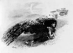 A return to the theme of the Demon coincided with the project initiated by the Kushnerev brothers and the editor Petr Konchalovsky who aimed to publish the two-volume book dedicated to the jubilee of Mikhail Lermontov with illustrations of "our best artistic forces". Altogether, there were 18 painters, including Ilya Repin, Ivan Shishkin, Ivan Aivazovsky, Leonid Pasternak, Apollinary Vasnetsov. Of these, Vrubel was the only one who was completely unknown to the public.[62] It is not known who drew the publishers' attention to Vrubel. According to different versions, Vrubel was introduced to Konchalovsky by Mamontov, Korovin and even Pasternak who was responsible for editing.[62] The salary for the work was quite small (800 rubles for 5 big and 13 small illustrations).[63] Due to their complexity, his paintings were hard to reproduce and Vrubel had to amend them. The main difficulty, however, was that his colleagues did not understand Vrubel's art. In spite of this, the illustrated publication was approved by the censorship authorities on April 10, 1891. Immediately thereafter the publication was widely discussed in the press who harshly criticized illustrations for their "rudeness, ugliness, caricature, and absurdity".[64] Even people who were well-disposed to Vrubel did not understand him. So the painter changed his views on aesthetics, suggesting that the "true art" is incomprehensible to almost anyone, and "comprehensibility" was as suspicious for him as "incomprehensibility" was for others.[65]