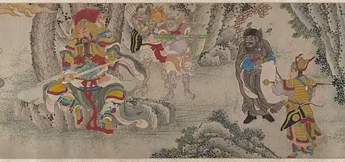 The navy was not a separate entity during the Ming era and was part of the guard battalion system. Every coastal guard battalion was allotted 50 ships for maritime defense. The Ming also set up naval palisades, beacon towers, strategic forts, and irregular military units and warships.[17] Unfortunately these defensive measures proved largely inadequate against pirate raids, and conditions continued to deteriorate until the Jiajing wokou raids were ended by Qi Jiguang and Yu Dayou.[36] Shaolin monks also took part in anti-piracy campaigns, most notably between 21 and 31 July 1553 at Wengjiagang, when a group of 120 monks exterminated over 100 pirates with only 4 monks dead.[37]