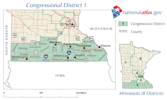 Minnesota's 1st congressional district spans southern Minnesota from the border with South Dakota to the border with Wisconsin. It is a primarily rural district built on a strong history of agriculture, though this is changing rapidly due to population growth in the Rochester combined statistical area. The district also includes several of Minnesota's major mid-sized cities, such as Rochester, Mankato, Winona, Austin, Owatonna, Albert Lea, Red Wing, New Ulm, Worthington, and Lake City. It is currently represented by Republican Brad Finstad.