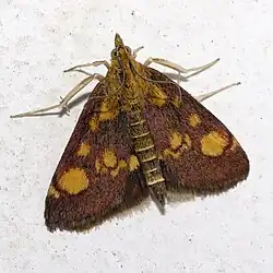 Pyrausta aurata has a wingspan of 18–20 millimetres (0.7–0.8 in).[7] The forewings are purplish-brown with golden yellow markings.[7] The number and intensity of these markings is quite variable. Usually in the forewings there is a single postmedian round golden spot near the costa, often with some other minor golden spots.[8][9] The yellow spots can also be greatly reduced up to complete absence. Sometimes there is an almost indistinct wavy golden postmedian line between the dorsum and the main golden spot.[8][9] The hindwings are dark brown or also black with a broad yellow transverse band approximately in the wing center and without additional spot closer to the basal area.