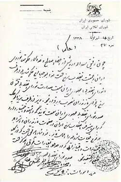 Saadollah Darvish is appointed as the Chair of the Revolutionary Council (Commissar) of the forces missioned to Mazandaran Province, to promote the Red Iranian Revolution in that province. The letter is signed by Mirza Kuchak Khan (his usual signature Kuchek-e Jangali i.e., Kuchek of the Jungle) and other members of the Revolutionary Council of The Republic of Iran, 1920. The tone and the terminology used in the letter shows the revolutionary fervor of the time and, contrary to the suggestion of conservatism on Mirza's side by some historians, his devotion to the ideas of socialism.
