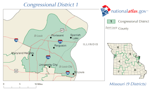 Missouri's 1st congressional district is in the eastern portion of the state. It includes all of St. Louis City and much of northern St. Louis County, including the cities of Maryland Heights, University City, Ferguson and Florissant. With a Cook Partisan Voting Index rating of D+29, it is the most Democratic district in Missouri.[2] Roughly half of the district's population is African American.