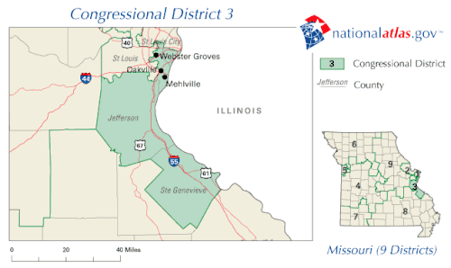 Following a dramatic drop in the population of St. Louis in the 2010 United States census, Missouri lost a congressional seat effective in 2013. Redistricting maps indicated that the 3rd district would be dismantled. The 3rd's home base in St. Louis would be absorbed by Missouri's 1st congressional district. Much of the district outside the St. Louis area would be drawn into the 8th district. Meanwhile, the new 3rd included most of the territory currently in the 9th district, which was dissolved.[3]