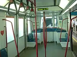 The interior of the Sengkang and Punggol LRT trains feature an indigo seats and red grab poles. 16 of the C810s that underwent modification have two seats in the front and back converted into perch seats, thus reducing the number of seats to 14 from the usual 18 seats.
