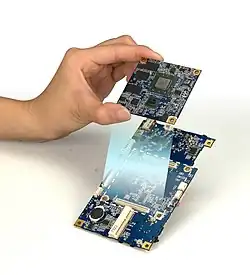 The prototype boards shown to date include a x86-compliant 1 GHz VIA C7-M processor, 256 or 512 megabytes of RAM, a modified version of the VIA CX700 chipset (called the CX700S),[3] an interface for a cellular radio module (demonstration boards contain a CDMA radio), a DC-DC electrical converter, and various connecting interfaces.