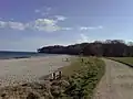 Moesgård Beach is a public Blue Flag beach in Aarhus Municipality in Denmark. The beach is located in the southern outskirts of Aarhus in the Marselisborg Forests on the Bay of Aarhus in the suburb of Højbjerg. Helgenæs lies across the bay to the east, a bit inland to the west is the Marselisborg Deer Park and to the north is the Varna Palace. The beach area is some 1000 meters long and between 25 and 40 meters wide. It is a white sandy beach with occasional rows of boulders extending into the sea, for coastal erosion protection. Moesgård Beach is popular for sunbathing and swimming due to the shielding effects and scenic views of the nearby forests on the steep hillsides to the west. The beach has a single jetty extending some 20 meters into the sea, offering a platform to jump from or relax on. The Beach is open year-round for everyone at no charge.[1]