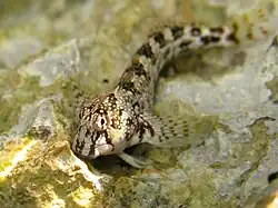 Montagu's blenny is small and has an elongated body which has no scales, its eyes are set on top of the head and its mouth points downwards. It attains a Total Length of 8.5 centimetres (3.3 in). The background colour is pale brown marked with olive-green vertical stripes and light blue spots. There is a single dorsal fin that runs along the total length of its body with an obvious notch part of the way along. There is fringed, fleshy crest situated between its eyes and, in at least in Britain and Ireland, this feature distinguishes Montagu's blenny from the other species present. The fleshy crest continues along the dorsal surface of the blenny as a series of short fleshy tentacles. It has large pectoral fins which are used to grip on to rock surfaces and resemble limbs.[4] The fish in the Atlantic specimens often have dark-spots compared to Mediterranean populations. When spawning the males become uniformly dark or show a marbled pattern and have a white upper lip.[5]