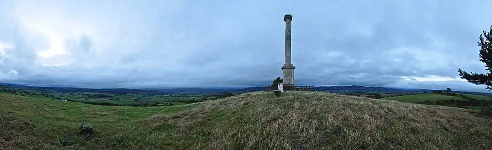 Built in form of a Doric column from Portland stone, the memorial was completed in 1923 and is just over 20 feet tall.[3] The memorial can be reached by taking a footpath opposite the entrance to Montgomery Castle Car Park. The trail continues uphill along a dirt track, eventually leading to a level grassland where the monument can be seen in the distance.