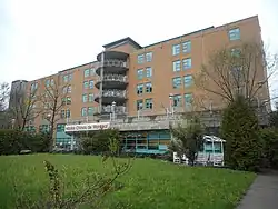 This temporary shelter closed its doors in 1919, and the Nuns returned to their convent. In 1919 or 1920, the Chinese community in Montreal acquired a former synagogue, to serve as their permanent hospital, located at 112 De la Gauchetière Street (it is now a commercial building), in present-day Chinatown. Health care would be provided at this location for the next 45 years.[3] The city of Montreal declared the location unfit to serve as a medical institution in 1962, and the following year the Chinese community raised CAD$1,000,000 toward constructing a new facility.[3] A new 65-bed hospital opened in 1965 located at 7500 Saint-Denis Street, corner Faillon Street East, in the borough of Villeray–Saint-Michel–Parc-Extension. The Montreal Chinese Hospital joined the Quebec Hospital Association in 1966, and from then on, its operating expenses were covered by the Quebec government.[4] [5][6]