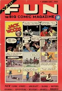 In the latter half of 1934, having seen the emergence of Famous Funnies and other oversize magazines reprinting comic strips, Malcolm Wheeler-Nicholson founded National Allied Publications and published New Fun #1 on January 11, 1935[3] (cover-dated February 1935). A tabloid-sized, 10-inch by 15-inch, 36-page magazine with a cardstock, non-glossy cover, it was an anthology of humor features, such as the talking animal comic "Pelion and Ossa" and the college-set "Jigger and Ginger", mixed with dramatic fare as the Western strip "Jack Woods" and the "yellow peril" adventure "Barry O'Neill", featuring a Fu Manchu-styled villain, Fang Gow.[1] The first issue also featured humor strip "Caveman Capers", an adaptation of the 1819 novel Ivanhoe, spy drama "Sandra of the Secret Service", and a strip based on early Walt Disney creation Oswald the Lucky Rabbit.[2]