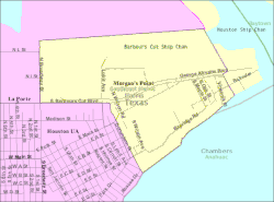 The area received a major economic boost in 1977 with the opening of the Barbours Cut shipping terminal, operated by the Port of Houston Authority. However, in building Barbours Cut, the Port of Houston used its power of eminent domain to evict residents from nearly one third of the community's homes.[10] Still the terminal almost instantly became the Houston area's most important shipping point and became the centerpiece of the economy activity at Morgan's Point.[11]
