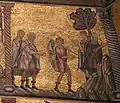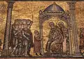 The last part of the interior to have mosaics added were the women's galleries between approximately 1300 and 1330.[1] These show angels and saints and their style agrees with Giovanni Villani's written evidence, which dates their completion to 1330 and probably dates the start of work to around 1300–1315. There are no art historical studies specifically on the mosaics of the women's galleries, though Venturi briefly notes that they were produced after 1300. The vault has a central motif of a starry sky, symbolic of the Empyrean, surrounded by angels with unclear attributes, possibly another set of angelic hierarchies.