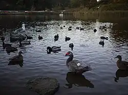 Another famous animal resident of Mountain Lake was Myrtle, a non-native whooper swan who was flightless after being pinioned.[22] Myrtle was well known in the neighborhood for disrupting traffic while crossing Lake Street and stealing snacks from the nearby Lake Market at 12th and Lake.[22] Other antics included visiting regular park patrons, watching tennis players, and attending picnics.[23] San Francisco Zoo officials believed the swan had imprinted on people sometime in the past.[23] Her last human "mate" was local resident Chuck Lantz, who lives next to Mountain Lake Park.[22] Shortly after dawn each morning Myrtle would loudly "whoop" at his back door, moving around the block and up his stairs until he responded and walked her back to the park.