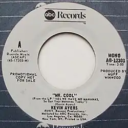 "Mr Cool" was Kevin Ayers' USA promotional single issued to publicize his album Yes We Have No Mañanas (So Get Your Mañanas Today).[1] It featured a mono mix of the song on one side coupled with a stereo mix on the flip side.