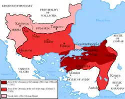 Murad I conquered Adrianople in 1360s and made it the new capital of the Ottoman Sultanate. Then he further expanded the Ottoman realm in Southern Europe by bringing most of the Balkans under Ottoman rule, and forced the princes of Serbia and Bulgaria as well as the Byzantine emperor John V Palaiologos to pay him tribute.[2] Murad I administratively divided his sultanate into the two provinces of Anatolia (Asia Minor) and Rumelia (the Balkans).