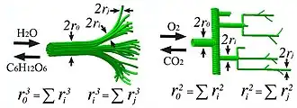 5. ^ Sherman 1981, p. 437: "If the volume of vessel tissue is proportional to the square of the internal radius (as when wall thickness is proportional to r), then Murray's derivation can hold for a biological vasculature even when the flowing fluid itself is inert and nonliving, as in the airways of the lungs, where the vessels are filled with air (of no metabolic cost) rather than with blood."