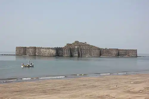 One example of such a failed attack was the account of the 10,000 soldiers who were sent by the Maratha Peshwa Moropant Trimbak Pingle, and who were roundly repulsed by the Janjira army in 1676.[23] During this Maratha assault, the Marathas, led by chatrapati Shivaji Maharaj, attempted to scale the 12-meter-high (39 ft) granite walls but failed in their attempts. Chatrapati Shivaji maharaj's son Chatrapati Sambhaji Maharaj even attempted to tunnel his way into the fort and was very close to capturing the fort. His attempt was thwarted when a Mughal army attacked the Maratha capital city, forcing Sambhaji to withdraw his forces from the siege and return to the Maratha capital.[24] He built another sea fort in 1676, known as Padmadurg or Kasa fort, to challenge Janjira. It is located northwest of Janjira. Padmadurg took 22 years to build and is constructed on 22 acres of land.