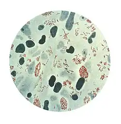 | Microphotograph of Mycobacterium leprae taken from a skin lesion. The small brick-red rod-shaped cells appear in clusters. Source: CDC | |
