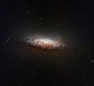 A series of dust lanes, some of which are backlit by the galaxy's core. This dust absorbs light from the core, reddening it and making the dust appear rusty-brown. The core itself glows brightly in a yellowish light indicating an older population of stars. Brilliant-blue regions of active star formation sparkle through the dust.[10] The galaxy doesn't show evidence of an outflow from the nucleus.[11] It has diffuse far ultraviolet emission from the outer regions of the galaxy and a diffuse halo. A faint shell is visible south-east of the galaxy.[7]
