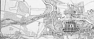 A general reconstruction with embellishments was carried out in 1936: in the park, there were a dozen of restaurants, cafes, beer gardens, playgrounds for children, as well as tennis courts, and a 9 ha leisure complex founded in 1928 by Sejm member Idzi Świtała.[22] The grounds were a propitious place for birds, with a lush vegetation: for 150 years, it has been considered as housing one of the largest colony of Thrush nightingales in Europe.[24] Some of the oldest trees were seen as natural curiosities such as a 36 m high black poplar with a trunk circumference of 300–500 cm.[25] The park started to become neglected in the 1960s, with the progressive expansion of Bydgoszcz and the unfavorable socio-economic climate: eventually, the old portion of the Canal became filled with rainwater and wastewater from the western part of the city.[25] In 1970, the decision of the municipal council to dry and fill the eastern section of the canal was the last straw: 624 m of canal, together with two locks and a bridge were destroyed to widen the thoroughfare.[9] This resulted in a decrease of the park area by one third, from 74 to 47 hectares, and for the Old Canal to become a dead branch, detached from Mill Island.