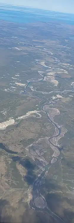 The community of Kugluktuk (formerly Coppermine) is located at the mouth of the Coppermine River, approximately 15.7 km (9.8 mi) to the west.[1]