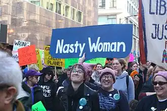 The Nasty Woman Movement is a movement that launched in 2016 as a result of a comment made by then-Presidential nominee Donald Trump. The phrase has been used by feminists that describe themselves as being "just as nasty – maybe even more nasty – than the woman [Hillary Clinton] Trump had attempted to denigrate, via a weaponized mutter."[13] The term is associated with the goals of the Women's Movement through a poem, "I Am a Nasty Woman", which was recited at the Women's March on Washington.[14] Its intent is to reclaim the pejorative term 'nasty'.[15] "The phrase [nasty woman] became a rallying cry for women everywhere",[16] and it has generated merchandise that bears the term 'nasty woman'.[17] Projects and exhibitions have used the term for their efforts to fundraise for Planned Parenthood.[18] Some celebrities favor the phrase, wearing 'nasty woman' T-shirts and expressing their support.[19] The support was most notable on Twitter, where the phrase was, approvingly, tweeted about.[20]