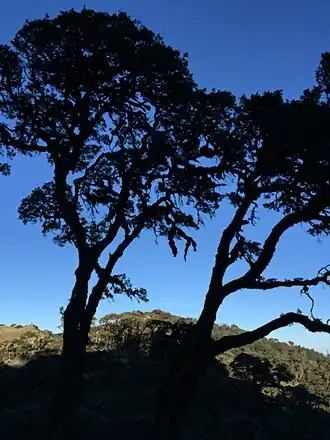 The peak is unique for the presence of trees, bushes and grass, which have adapted to the environment. On the way towards the top you will pass pine trees (Pinus kesiya), common names are Khasi pine, Benguet pine or three-needled pine. The local name is ထင်းရှူး [tʰḭ́ jú]) which is one of the most widely distributed pines in Asia, as well as many oaks (Quercus spp.). Epiphytes still cover older trees despite illegal picking; so many Coelogyne, Dendrobium and Cymbidium plants can be seen. Rhododendron arboreum flowers along roads during the dry season.