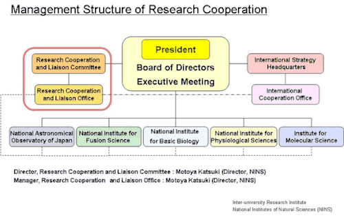 NINS established the Research Cooperation and Liaison Committee under the authority of the president, to discuss and plan matters of research cooperation. It has also established the Research Cooperation and Liaison Office, which is in charge of implementing plans made by the Research Cooperation and Liaison Committee. The Research Cooperation and Liaison Office has set "Imaging science" and "Hierarchy and Holism in Natural Science" as themes for cooperation across fields, and is promoting symposiums and other projects under these themes.
