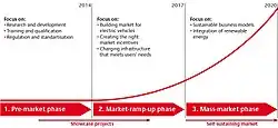 The NPE considers electric mobility as a total system of the components vehicle, energy supply, transport infrastructure and urban planning, which transcends the limits of traditional industry branches. This corresponds to the cross-sector and cross-disciplinary organization and operation of the NPE. The aim of the NPE is a self-sustaining market, which requires no political monetary support. To achieve the goals, the NPE recommends certain measures to the federal government and conducts regular reviews to their stage of development. The basis for their recommendations to support electric mobility is a three-phase model that reflects the different market stages.